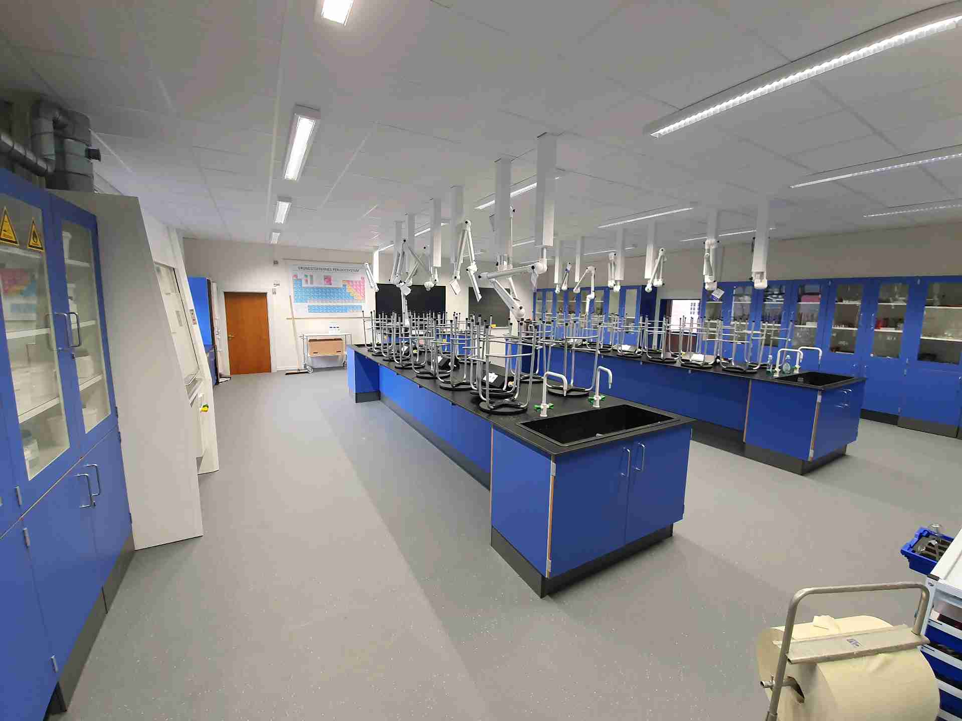 Fysiklokale – Niels Steensens gymnasie 30. november 2021 Gammelt fysiklokale med pulte og træbåde er fjernet, og alle overflader, gulve, lofter og installationer, ventilation mv. er skiftet til et super flot resultat.